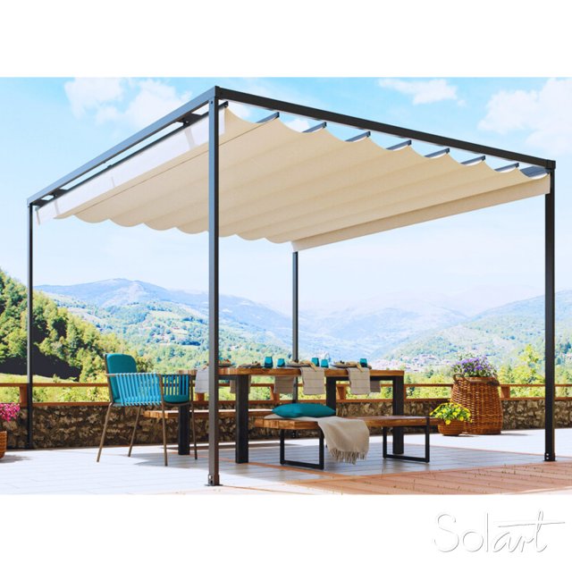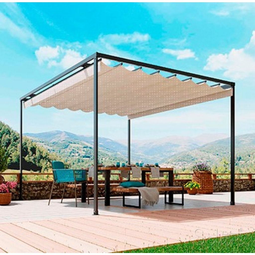 Una opción perfecta para jardines o zonas totalmente abiertas. Gracias a esta estructura autónoma, no necesita ningún anclaje a muros, lo que permite instalarlo en medio del espacio exterior, ofreciendo sombra sin limitar el flujo visual ni afectar la estética del entorno. La cubierta está confeccionada con telas acrílicas impermeables, un tejido técnico de poliéster recubierto que repele el agua y resiste al sol.